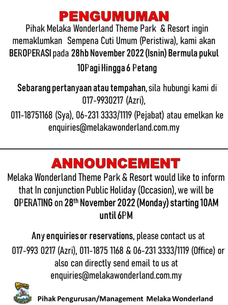 Melaka Wonderland is approximately 15 minutes from Melaka town, 1.5 hours from Kuala Lumpur International Airport (KLIA), 3 hours from Johor and 4 hours from Singapore.